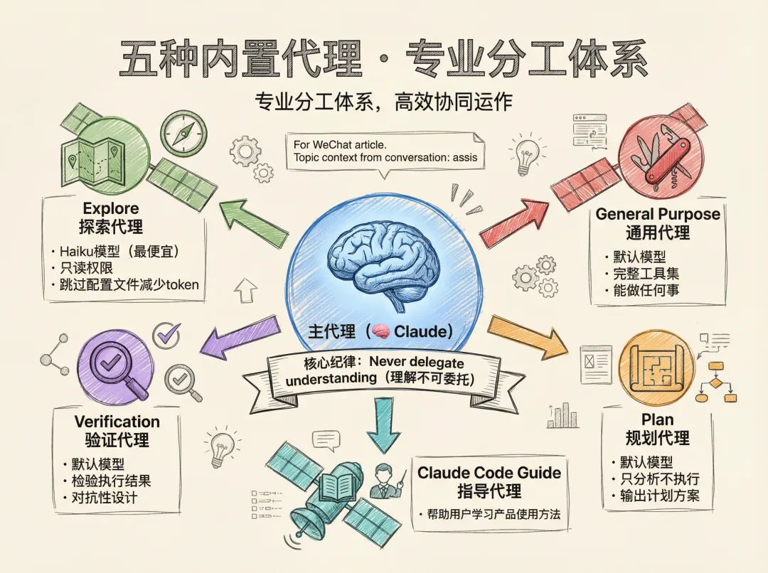 五种子代理各有专精:Explore 用最便宜的 Haiku、只读、跳过配置减 token;General Purpose 用默认模型、完整工具集;Plan 只分析不执行;Verification 对抗性检验;Guide 帮用户学产品。