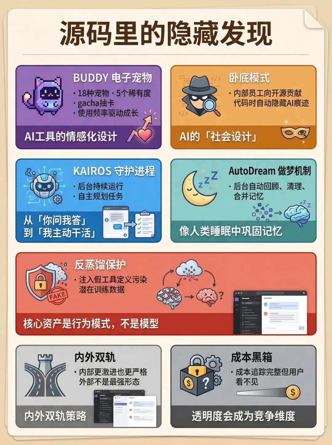 尚未覆盖的领域——AI 产品的经济模型(每个设计决策背后都有成本考量)、AI 的社会设计(卧底模式揭示的新维度)、AI 的情感化设计(BUDDY 宠物系统的认真探索)。