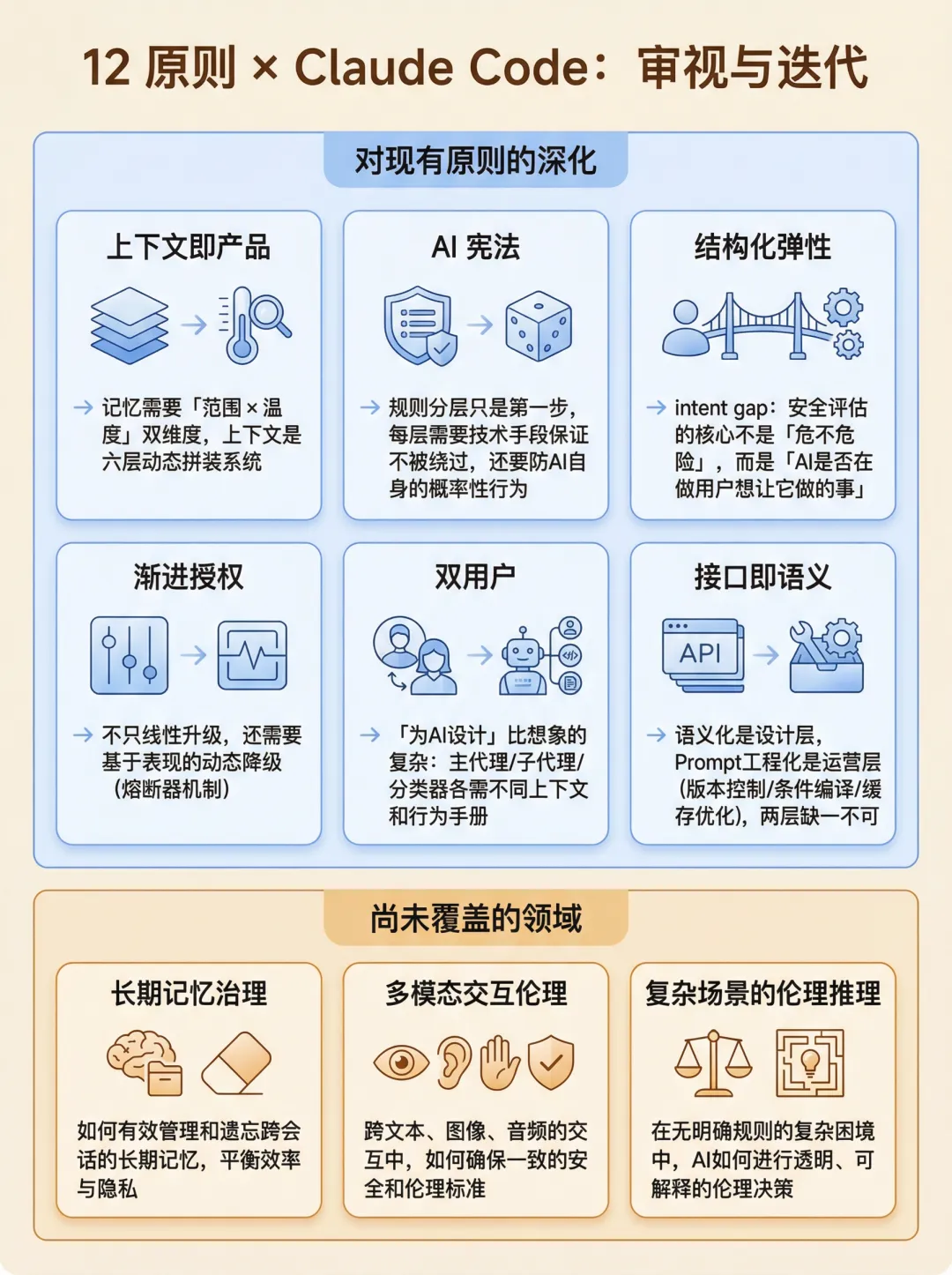 对现有原则的深化——上下文即产品需要「范围×温度」双维度;AI 宪法从规则分层延伸到六层技术落地且要防 AI 自身概率性行为;结构化弹性补充了 intent gap 概念;渐进授权不只线性升级还要动态降级;双用户中「为 AI 设计」比想象的复杂;接口即语义需要延伸到 Prompt 运营层的工程化。