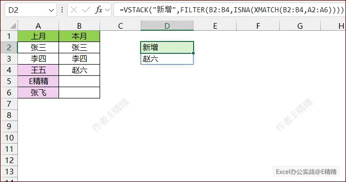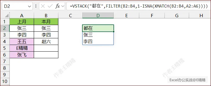 =LAMBDA(x,y,LET(a,TOCOL(x,1),b,TOCOL(y,1),i,ISNA(XMATCH(b,a)),j,ISNA(XMATCH(a,b)),VSTACK({“+增”,”-减”,”🔄在”}&”(“&HSTACK(SUM(N(i)),SUM(N(j)),SUM(N(1-i)))&”)”,IFNA(HSTACK(FILTER(b,i,””),FILTER(a,j,””),FILTER(b,1-i,””)),””))))(A2:A99,B2:B99)