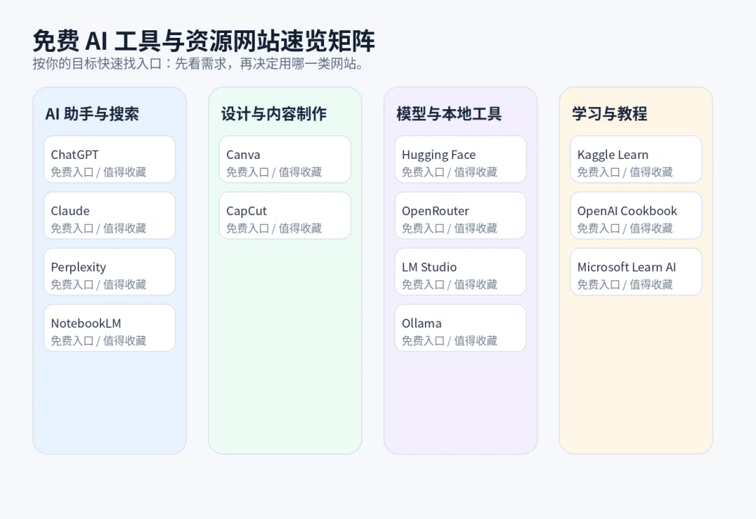 先看结论想找一个通用免费入口,优先看 ChatGPT、Claude、Perplexity;想把资料读透,优先看 NotebookLM;想做封面、图文和短视频,优先看 Canva 与 CapCut;想研究模型或跑本地,优先看 Hugging Face、LM Studio、Ollama;想系统补课,优先看 Kaggle Learn、OpenAI Cookbook、Microsoft Learn AI。 |