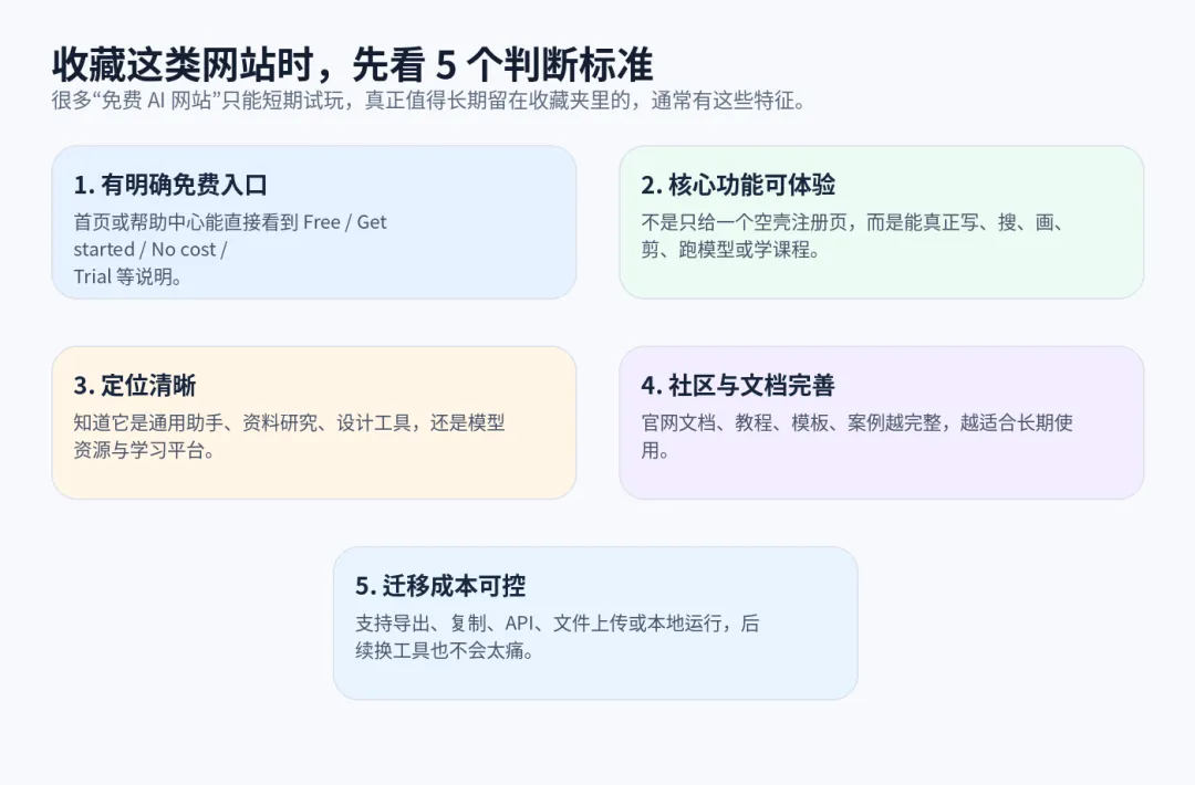 判断一个 AI 网站值不值得收藏,我通常只看五件事:第一,它有没有明确的免费入口;第二,核心能力能不能真正上手;第三,定位是否清晰;第四,文档、教程和社区是否完善;第五,后续迁移成本是否可控。