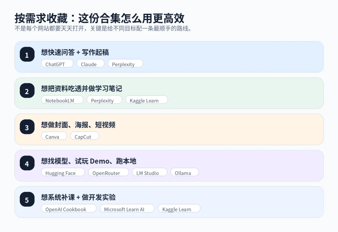 这类合集最怕的是“看完觉得很全,但过两天又忘了”。真正实用的做法,是把收藏夹按用途分成四个文件夹:聊天写作、设计剪辑、模型与本地、学习与教程。每类只留下 2 到 4 个最常用的站,剩下的放进二级目录。