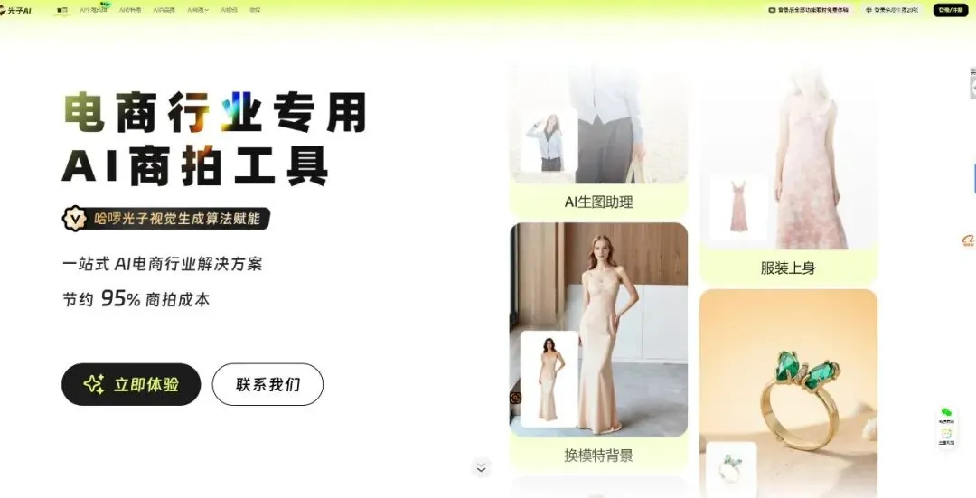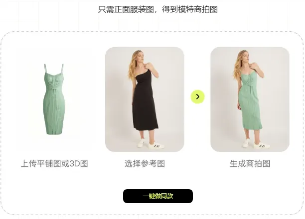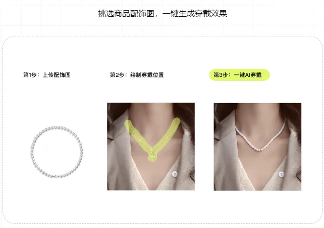 包含:AI 服装上身、换模特 / 背景、商品图、配饰穿戴、简单视频 -
