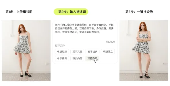 简单调整:可选模特肤色 / 姿势 / 场景,也能打字说自己想要的效果(比如穿搭风格、动作) -