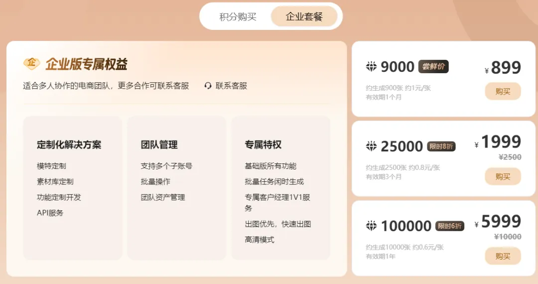 按人数 + 用量计费,可定制模特 / 素材库 -