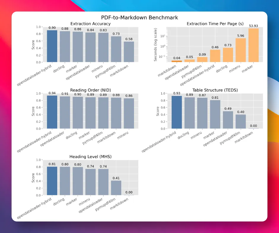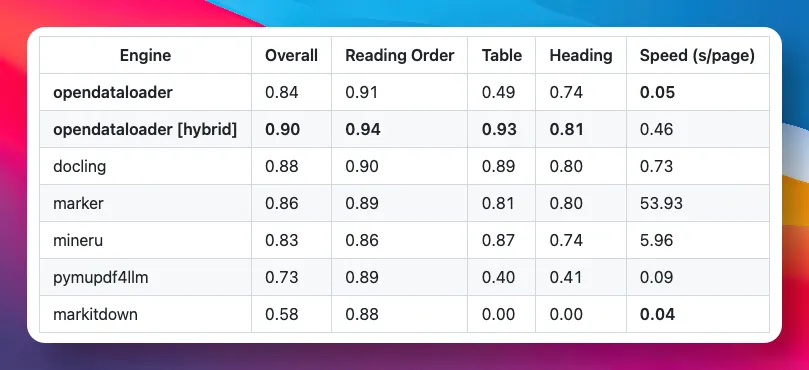 它在一个涵盖 200 份真实 PDF(含多栏文档、学术论文)的第三方 benchmark 里,综合精度拿了第一,得分 0.90,表格提取精度 0.93。