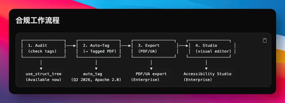 OpenDataLoader 的方案是:用同一套版面分析引擎,自动给无标签 PDF 生成结构标签,输出 Tagged PDF。