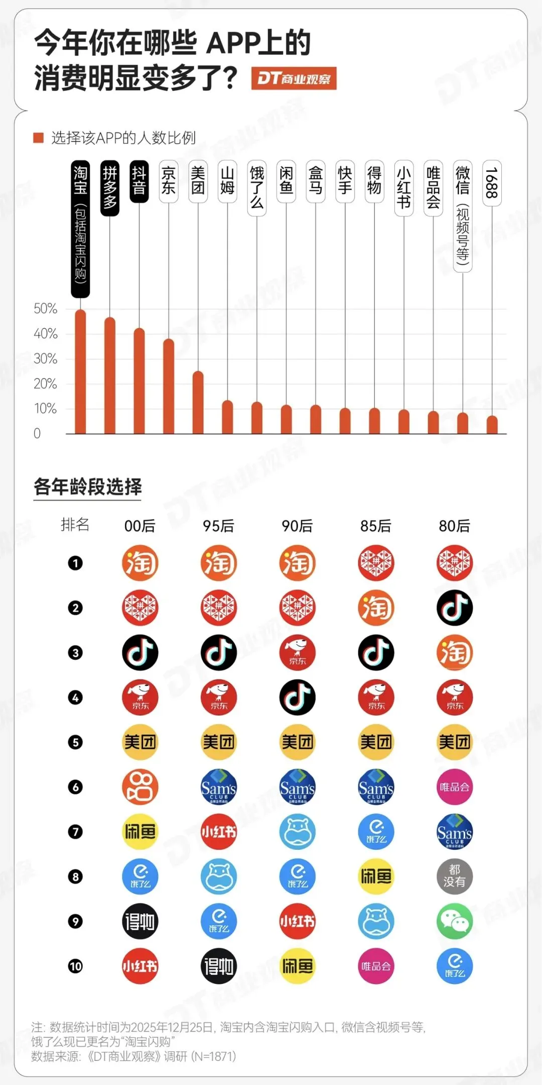 DT商业观察的一项调研显示:截至2025年末,消费者在部分APP上的支出明显增加。样本量1871人,这张图给出的不是“谁最大”,而是——谁拿走了新增消费。