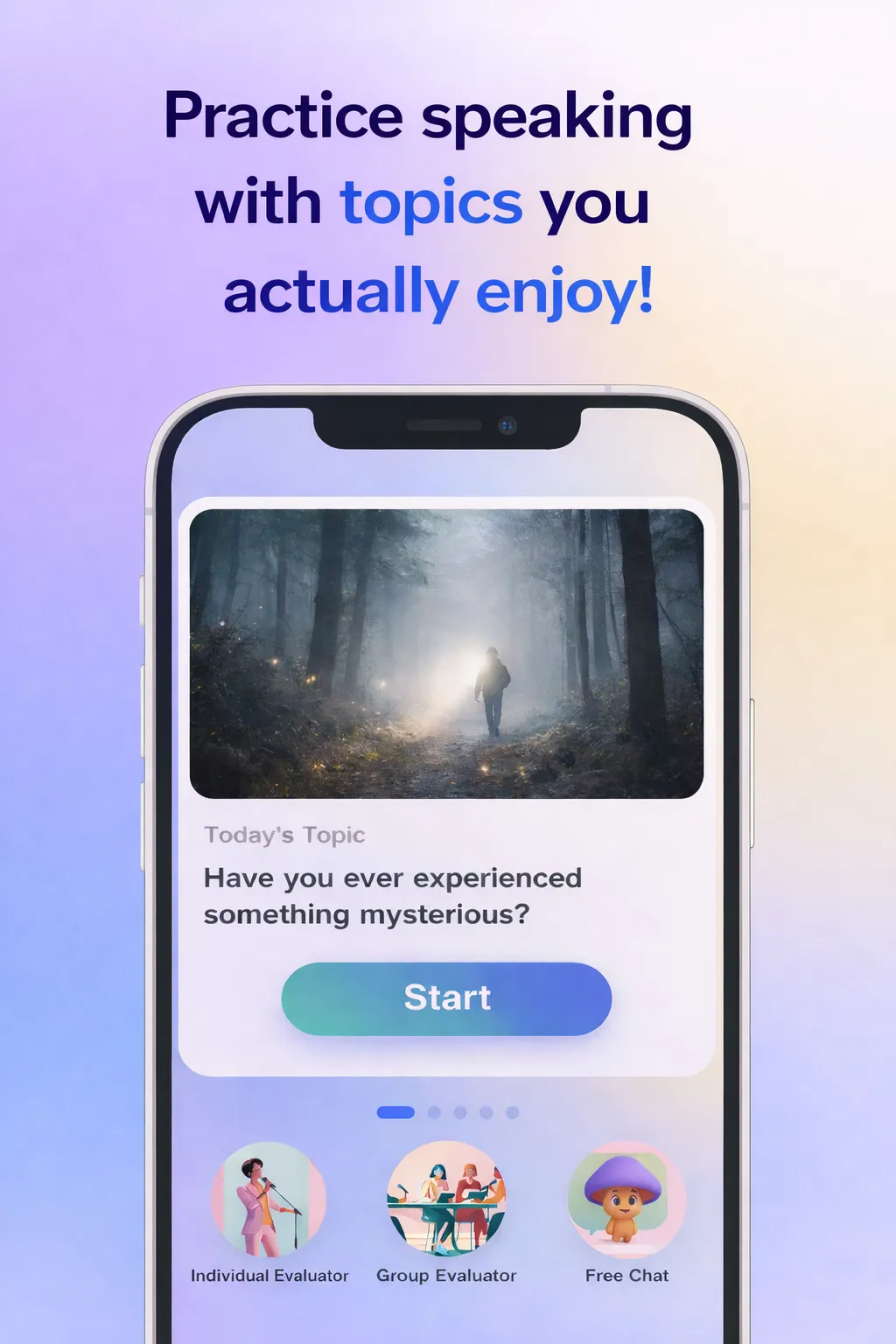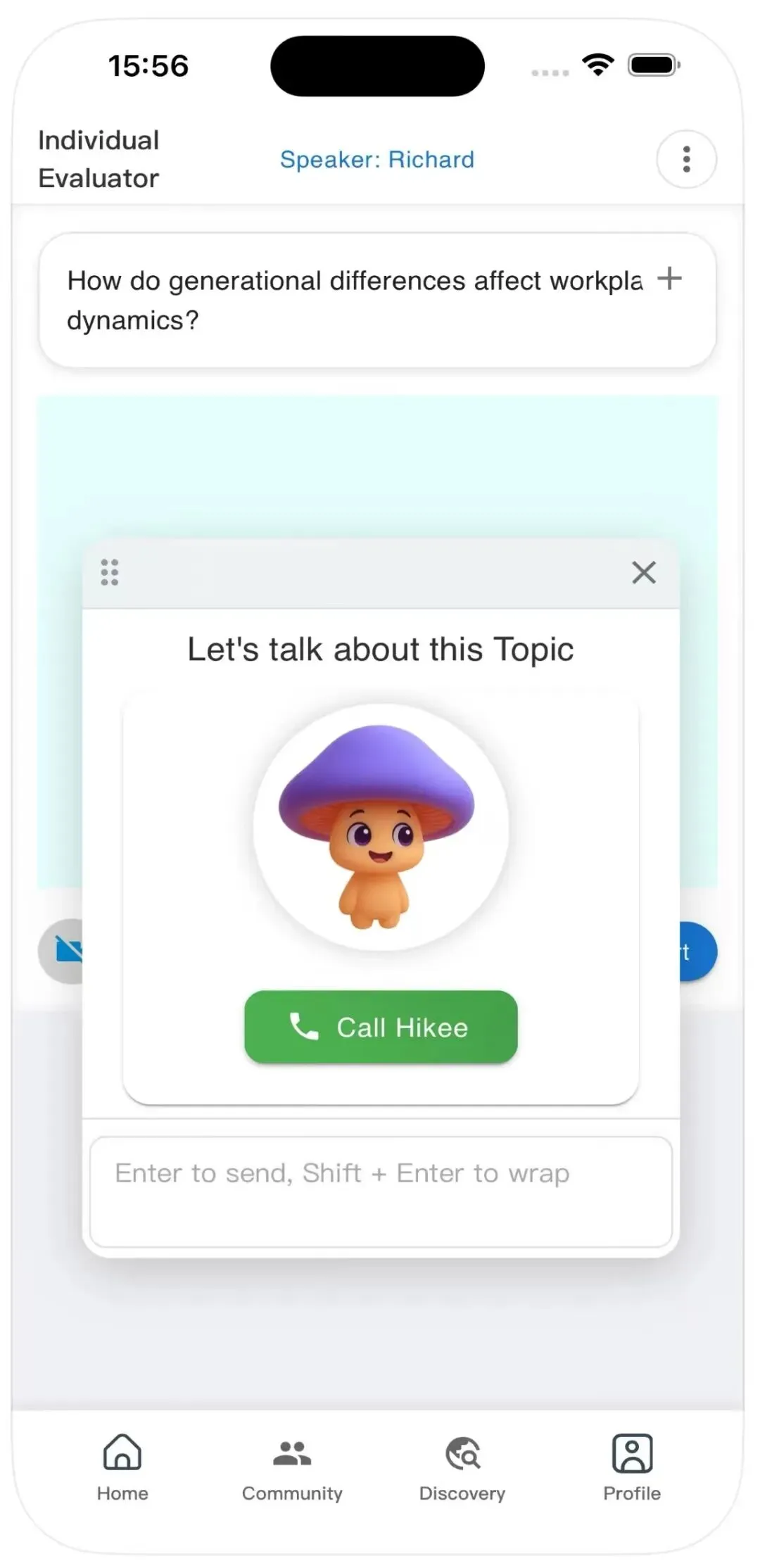 除了演讲训练,我们还有一个实时对话助手 Hikee。 它是一个小蘑菇形象的 AI 伙伴,你可以直接和它进行实时对话练习。