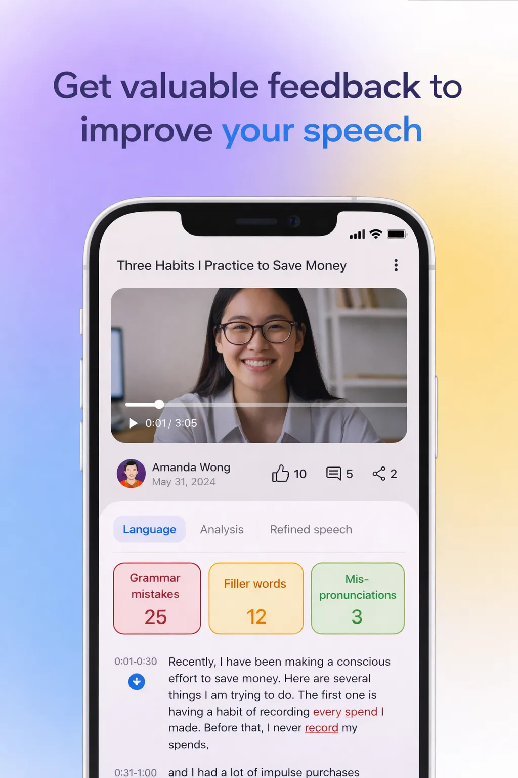 上传自己的演讲视频或音频后,可以获得更具体的分析,不再只是模糊地觉得“这次讲得一般”。