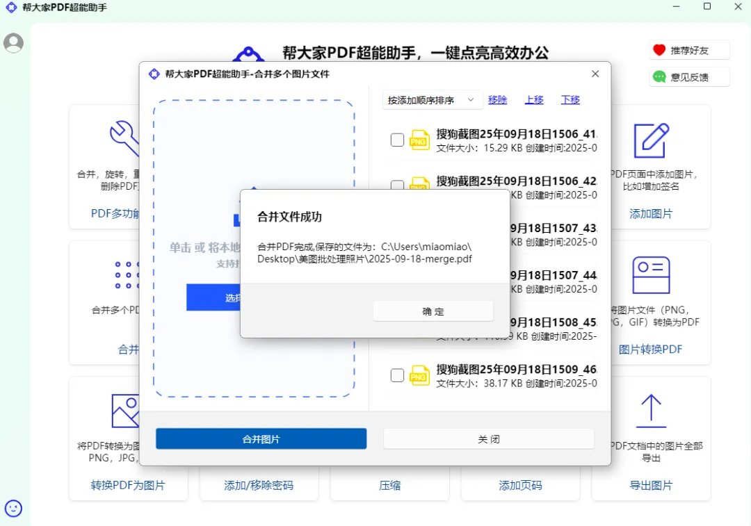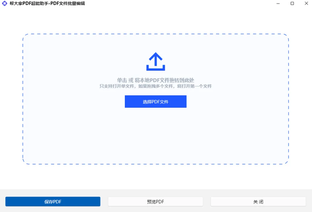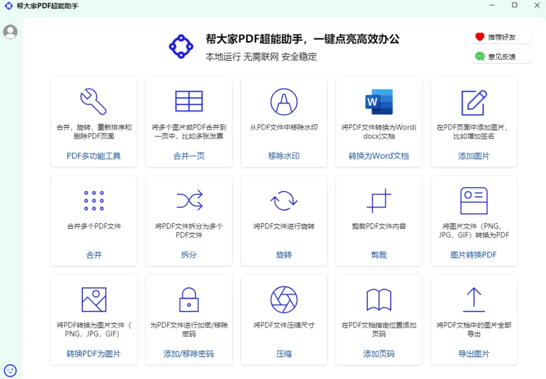 帮大家 PDF 超能助手,免费专业的 PDF 办公神器!集合并、拆分、压缩、加密解密、图片互转、PDF 转 Word、加水印去水印等 20 + 功能于一体,一键批量处理,操作简单上手快。所有文件本地运行不上传,隐私更安全,完全免费无限制,是你日常办公、整理文档的最佳帮手!