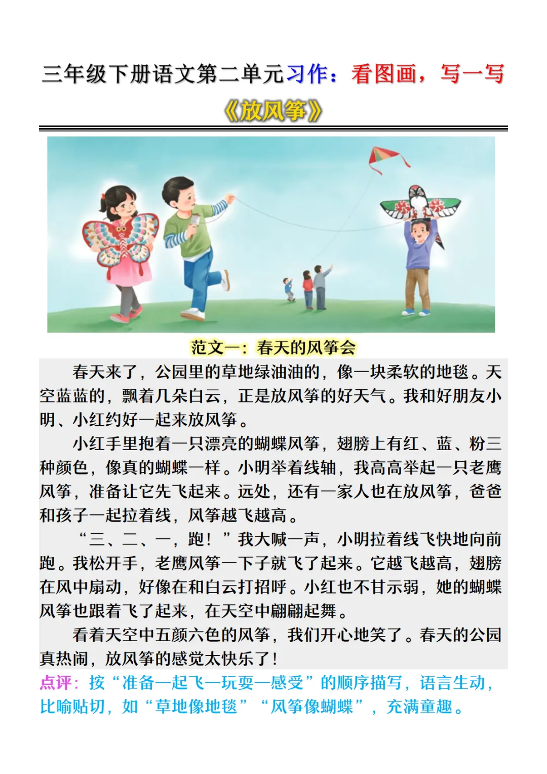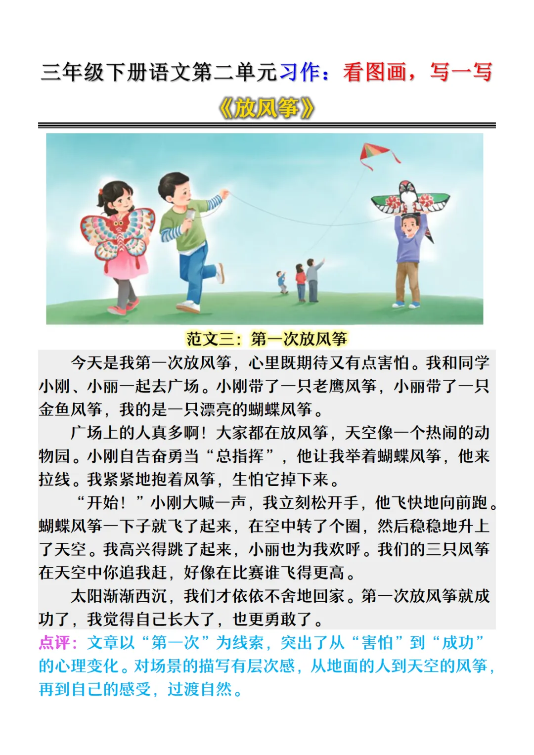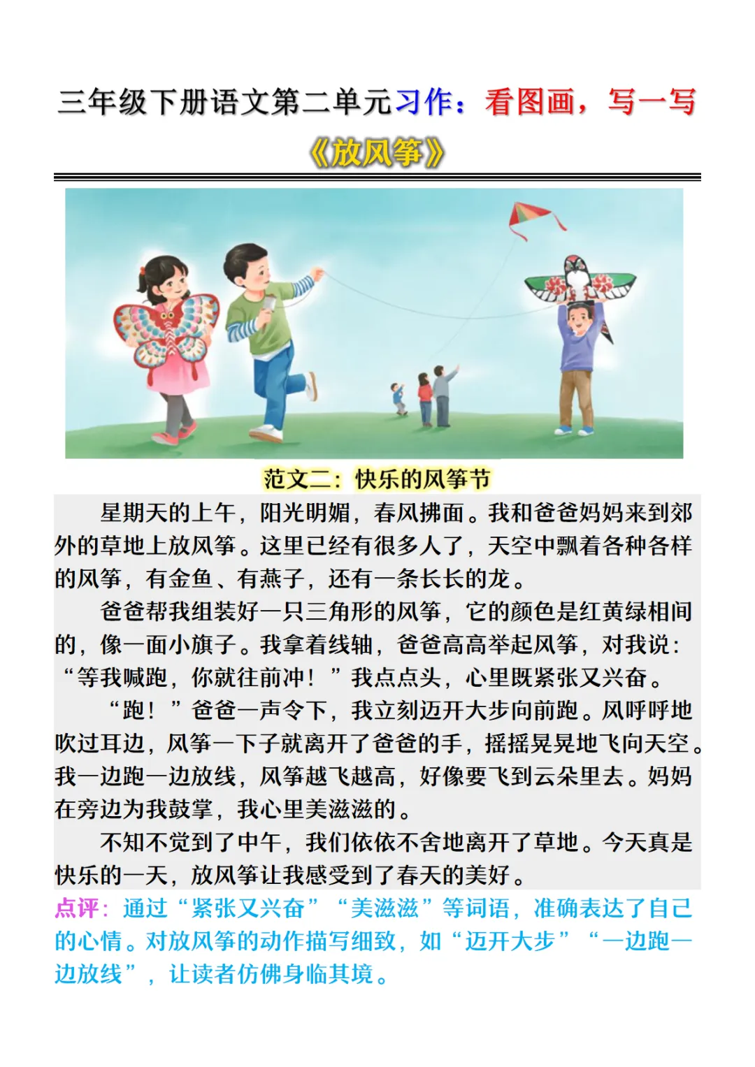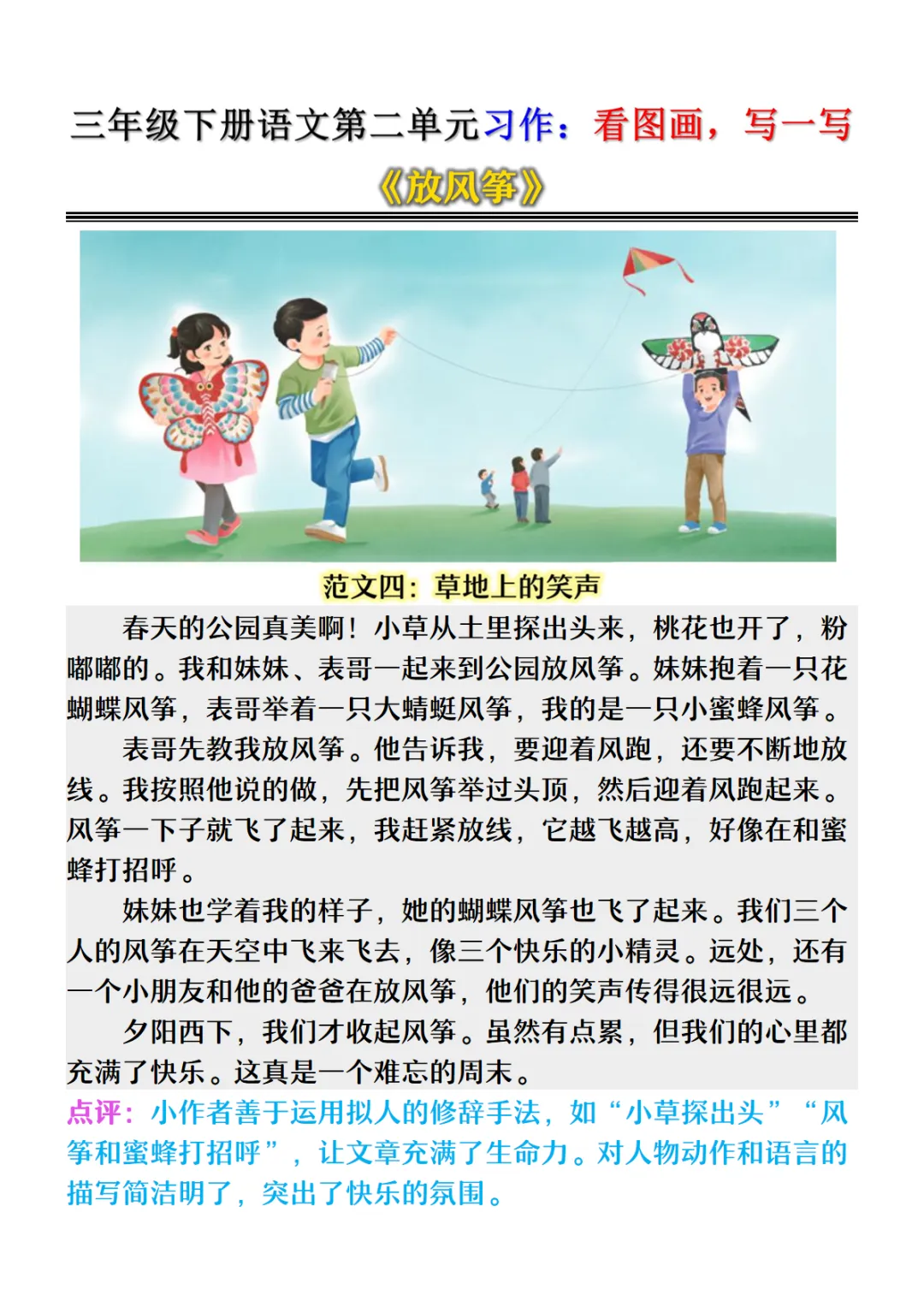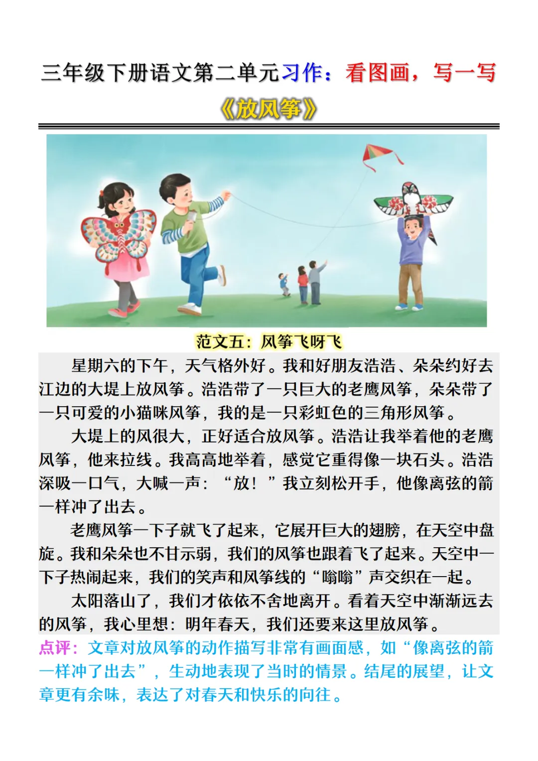 【免费下载】三年级(下)语文 第二单元《放风筝》优秀范文PDF高清电子版,可打印,百度网盘打包下载