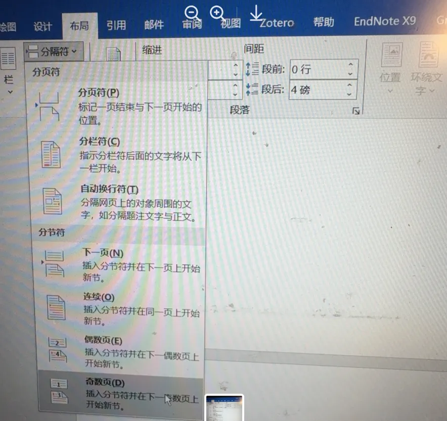一般分节符号分章节 如果要从奇数页下一章节则选中分节符奇数页。