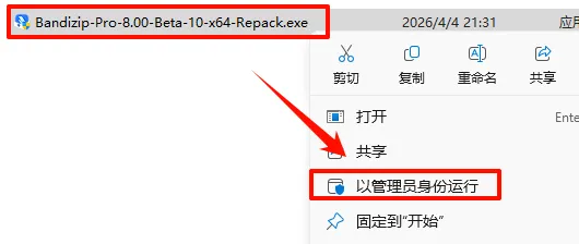 1.选中下载的安装包,鼠标右键点击“Bandizip-Pro-8.00-Beta-10-x64-Repack.exe”选择“以管理员身份运行”