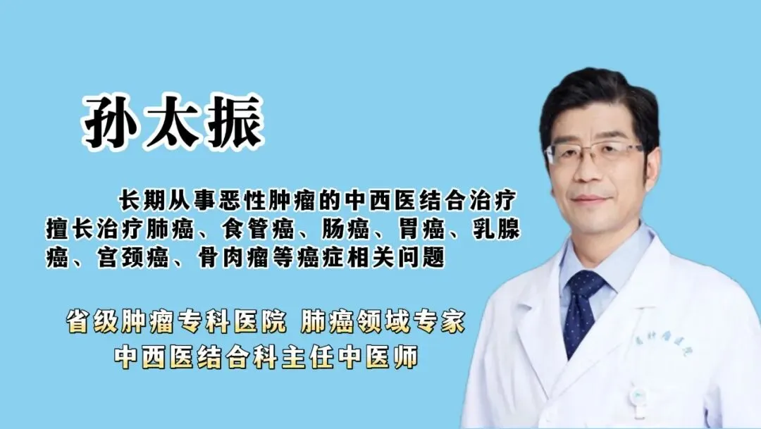 我是中西医结合科孙太振医生,中医治肿瘤三十多年,就想帮患者少走点弯路、少受点罪。如果你们正被肺癌、胃癌、乳腺癌、宫颈癌、肠癌、食管癌等这些癌症缠上,想咨询用药或者治疗建议,随时可以找我们。把自己的情况说清楚,我们一定尽力给你们靠谱的解答和帮助。