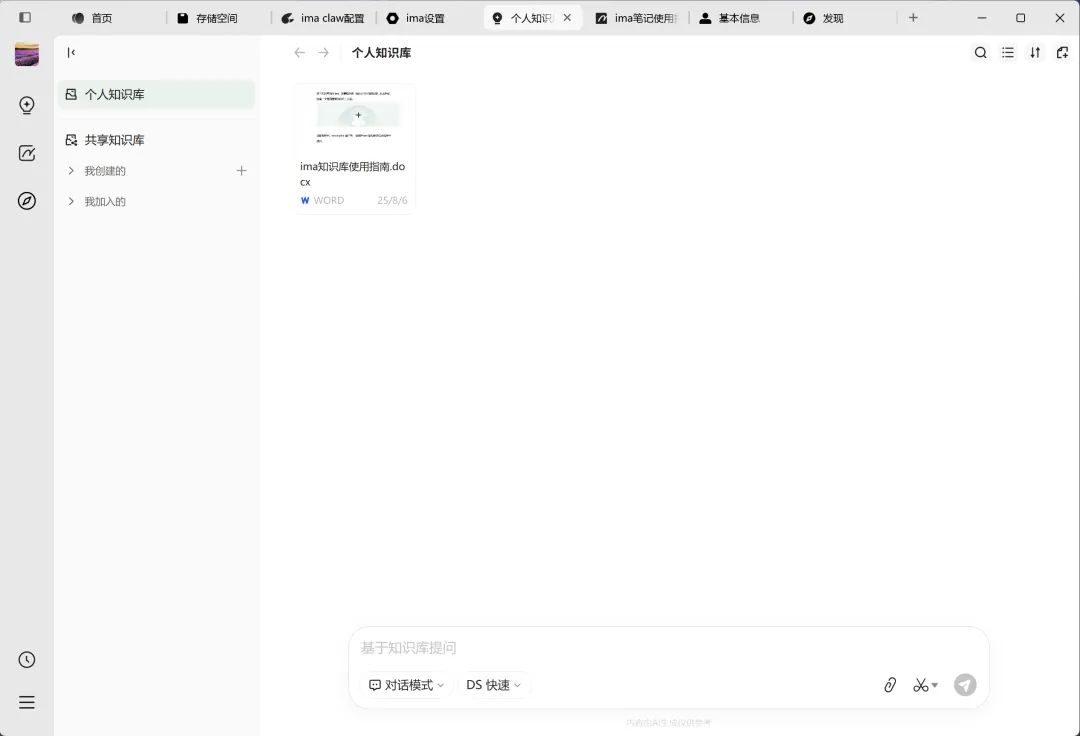 下图是ima的桌面版的知识库界面,你可以创建你自己的知识库,把本地的文件或文件夹上传到你自己的知识库里。你也可以加入别人分享给你的知识库,当然,你可以向别人分享你的知识库。需要注意的是:ima 的桌面版/网页版只是一个客户端。你上传的文档会被同步到腾讯云进行向量化和存储,AI 推理也主要在云端完成。如果你本地的数据是需要隐私保护的私人数据,就不能使用ima。一句话总结:ima 是“用别人的服务器存知识”,你不需要关心服务器和部署。