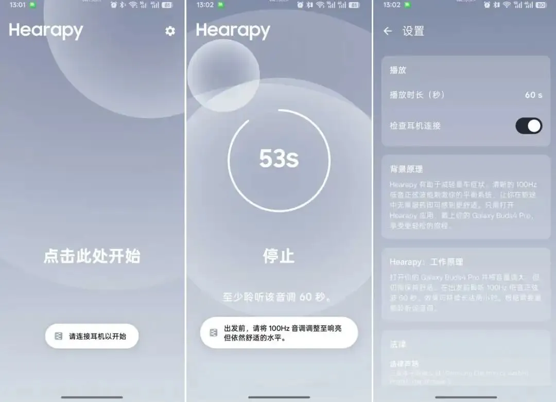 Hearapy 是三星基于科研成果开发的非侵入性声音疗法工具,专为辅助缓解晕车、晕船、晕机等晕动症不适打造。