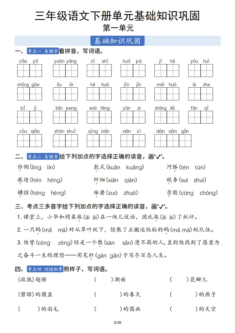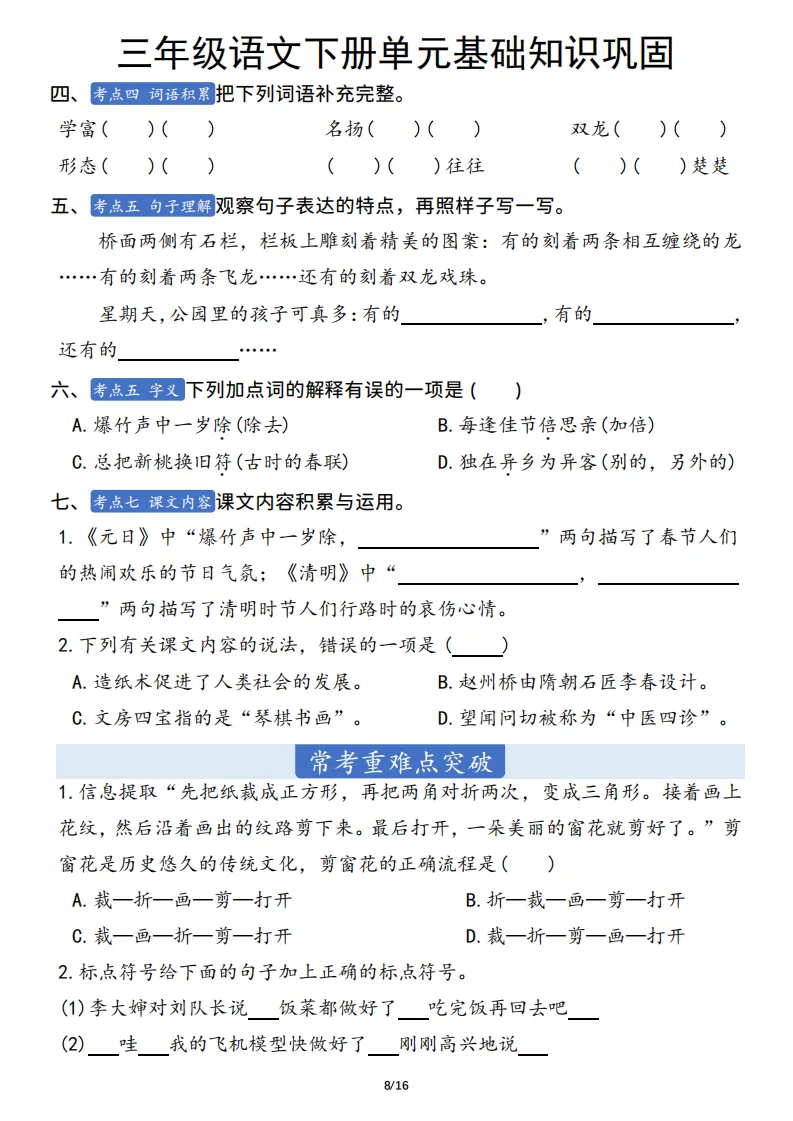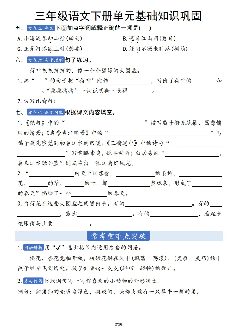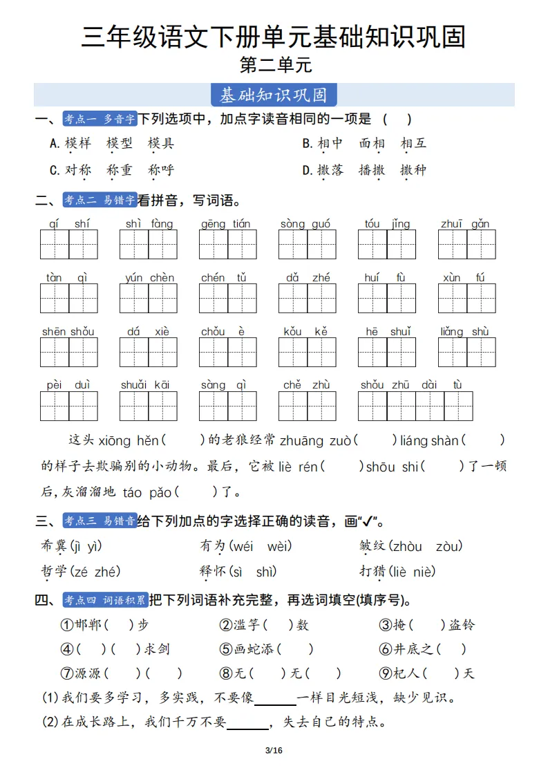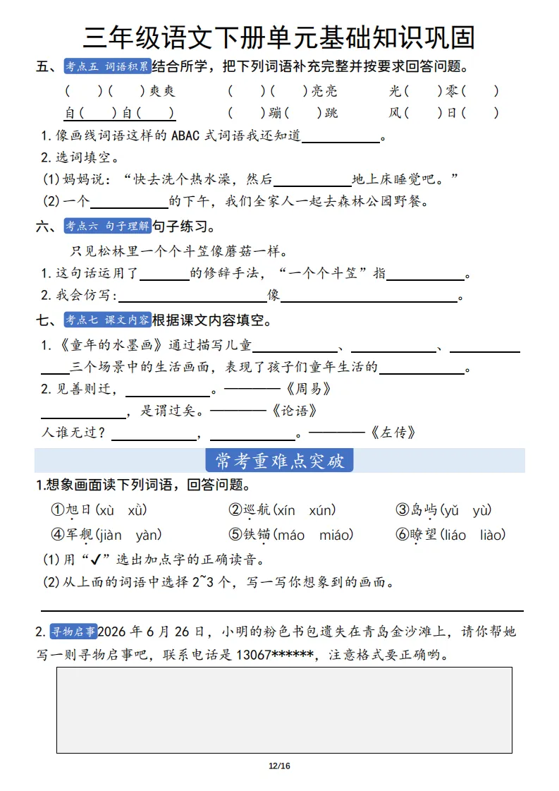 三年级语文下册单元基础知识巩固 ,电子版可打印 点击上方关注领取更多学习资源 三年级语文下册单元基础知识巩固 ,电子版可下载,同步教材每课内容。需要的家长抓紧打印出来,让孩子用起来。 (温馨提示:文末有完整电子版领取方式) 免费领取电版 关注公众号:“博学小课堂” 文章文末:点赞+再看 发送关键字:260404 说明 教辅在精不在多 ,如果觉得资料好,孩子需要正常使用 ,建议购买正版图书本公众号分享教辅资料,是为了给大家介绍、展示教辅资料的内容和特点,推荐大家购买正版教辅。 为了更好地展示资料的情况,我们可能会用到一些资料的截图、官方的样书,或者网络上公开的电子资料,如果权利人认为这些展示可能会侵害到您的权利,请直接告知我们,我们会立刻删除。