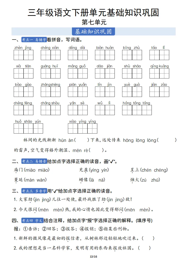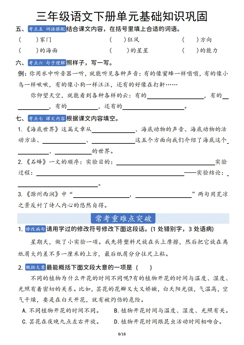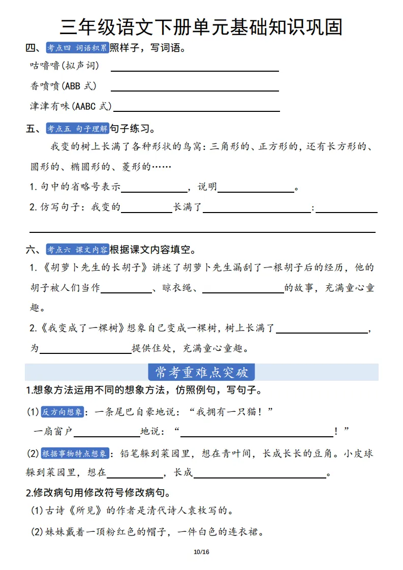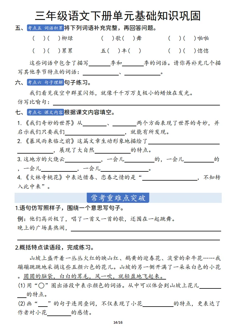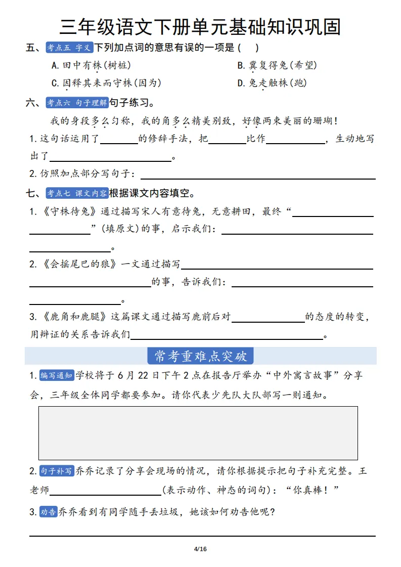 三年级语文下册单元基础知识巩固 ,电子版可打印 点击上方关注领取更多学习资源 三年级语文下册单元基础知识巩固 ,电子版可下载,同步教材每课内容。需要的家长抓紧打印出来,让孩子用起来。 (温馨提示:文末有完整电子版领取方式) 免费领取电版 关注公众号:“博学小课堂” 文章文末:点赞+再看 发送关键字:260404 说明 教辅在精不在多 ,如果觉得资料好,孩子需要正常使用 ,建议购买正版图书本公众号分享教辅资料,是为了给大家介绍、展示教辅资料的内容和特点,推荐大家购买正版教辅。 为了更好地展示资料的情况,我们可能会用到一些资料的截图、官方的样书,或者网络上公开的电子资料,如果权利人认为这些展示可能会侵害到您的权利,请直接告知我们,我们会立刻删除。