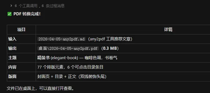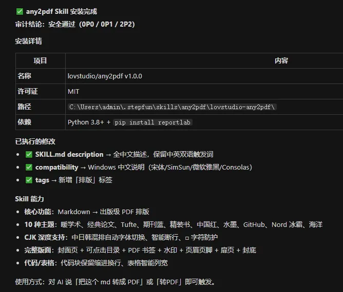 它就会自动调用 md2pdf.py,生成一份专业 PDF。整个过程你不需要知道参数是什么、脚本在哪、Python 怎么跑——Agent 全帮你处理了。