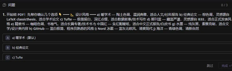 不适合的场景也说说:如果你需要复杂的学术排版(公式多、交叉引用、参考文献),LaTeX 还是老大,这个替代不了。它解决的是”80% 的日常 PDF 需求”这一块。