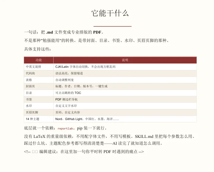 any2pdf 的定位很清晰:不追求 Pandoc 那种全能,专注”AI Agent 场景下的 Markdown → 专业 PDF”这一个事。reportlab 纯 Python 渲染,跨平台,依赖轻量,CJK 原生支持。