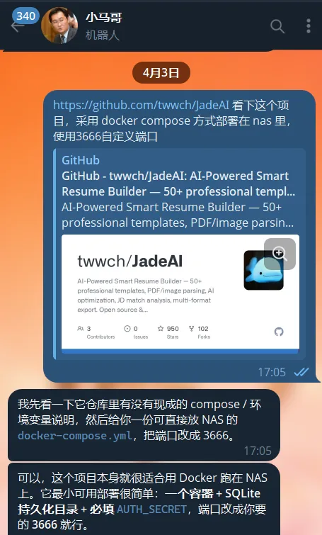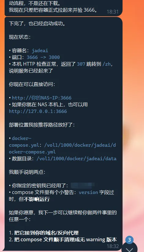 另外,从部署角度看,它也属于对 NAS 用户比较友好的项目:你既可以按 README 自己改成 Docker Compose 来部署,也可以像我这次这样,直接通过对话把需求讲清楚,让 AI 帮你完成从文档理解到实际落地的整个过程。