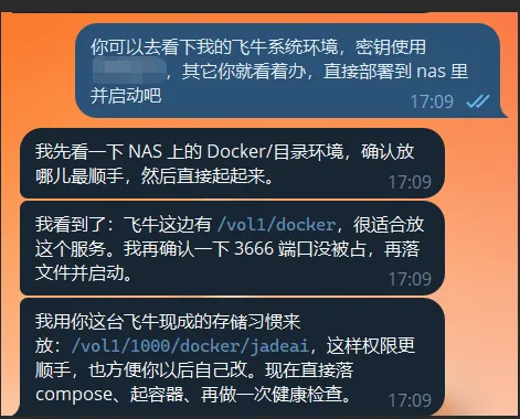 2、直接通过对话,让 AI 按我的 NAS 环境代我完成部署