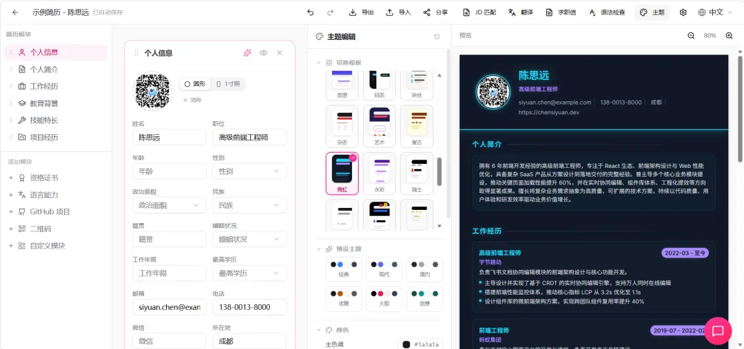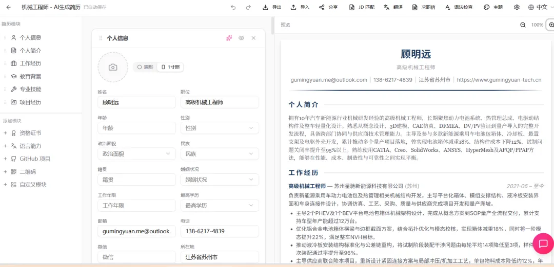 如果只看功能列表,你会觉得它是一个“很全的 AI 简历工具”。 但我自己的实际感受是,它更像在做一件更完整的事: