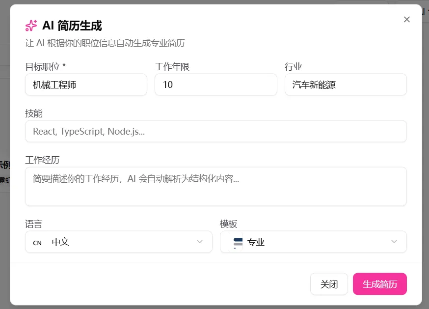 你知道自己做过什么,也知道自己会什么,但真要把这些经历整理成一份结构化、像样的简历,往往会卡很久。 这也是 AI 生成简历最有价值的地方:先帮你搭出一个初稿。