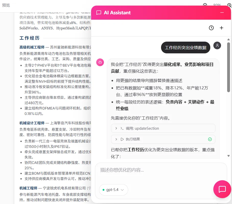 如果说生成简历解决的是“先写出来”,那我觉得 AI 修改 / 优化简历 解决的,反而是更现实的问题: