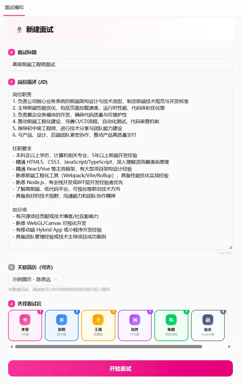 从 JadeAI 的项目文档来看,它支持结合岗位 JD 来做模拟面试,并且不是一个简单的聊天窗口,而是尽量往真实面试场景靠: