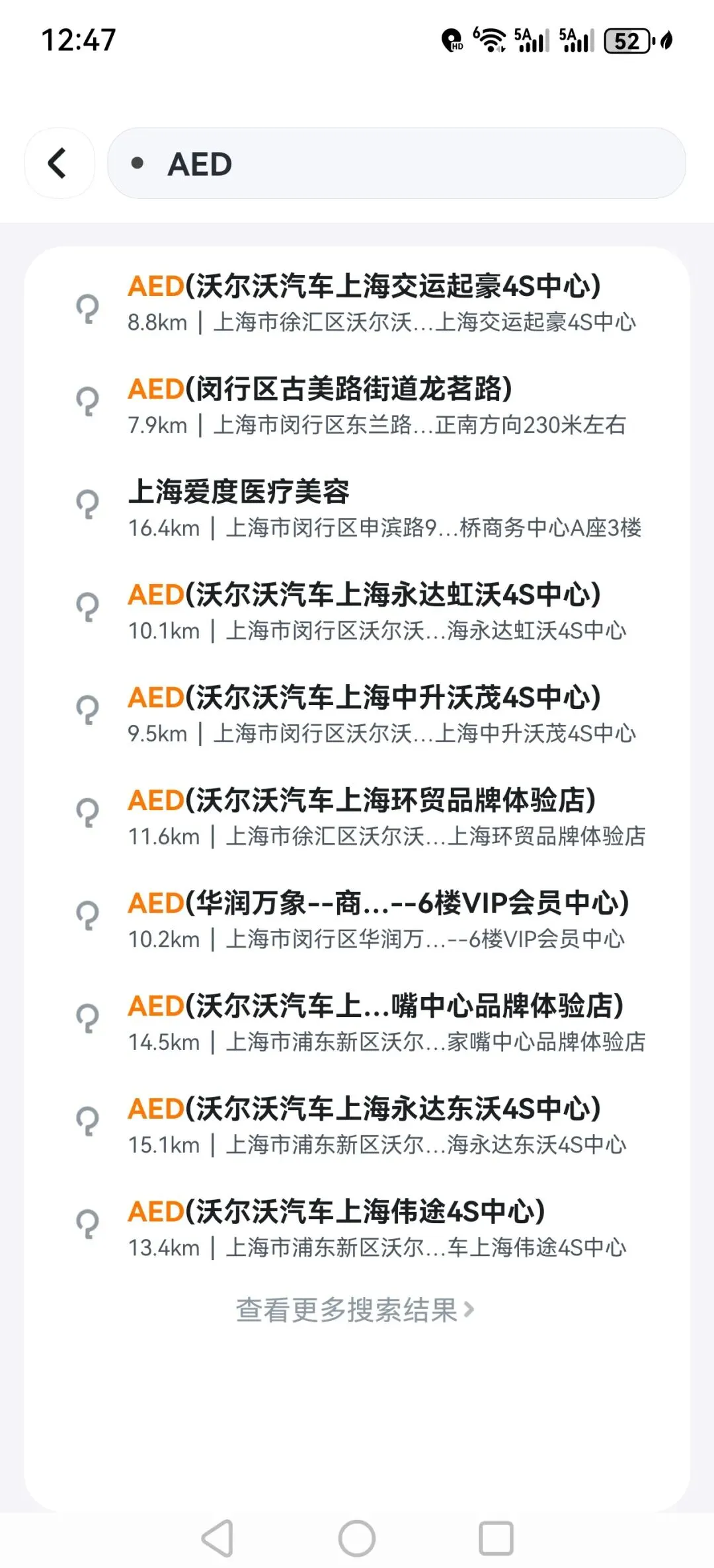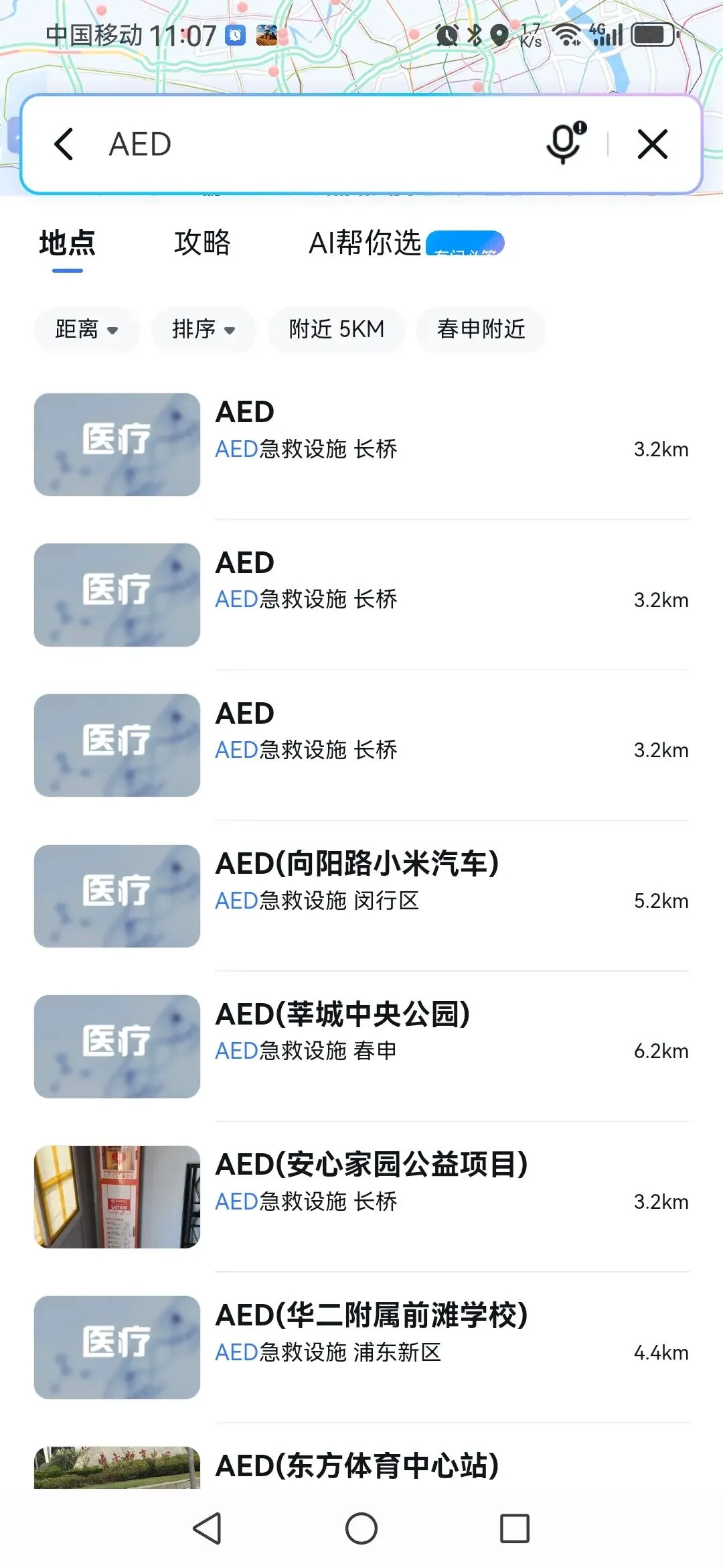 – 主流地图APP搜索“AED”,结果很少、很远、不实用,如下图。