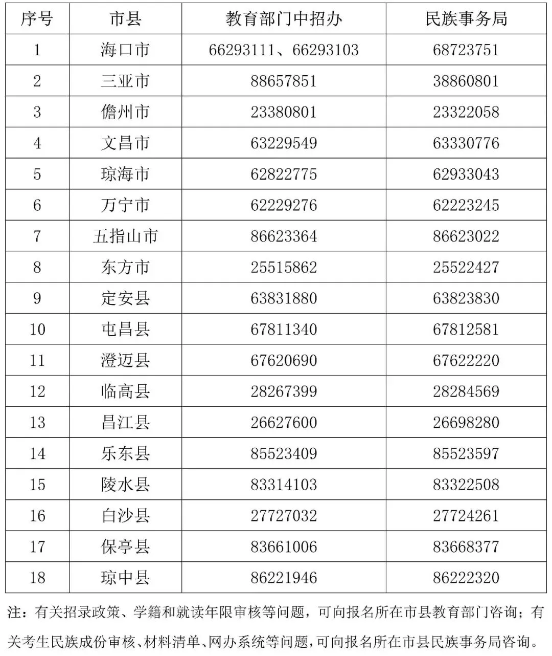 普通高中少数民族特招班申办中!流程说明→ 海南中考少数民族身份确认进行中,时间为2026年4月3日17:00—4月17日17:00。 参考文章: 《海口中考生注意!少数民族特招生4月3日起开始身份确认》 具体流程如下: 各市县教育部门、民族事务局业务咨询电话 来源:海南考试