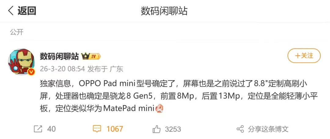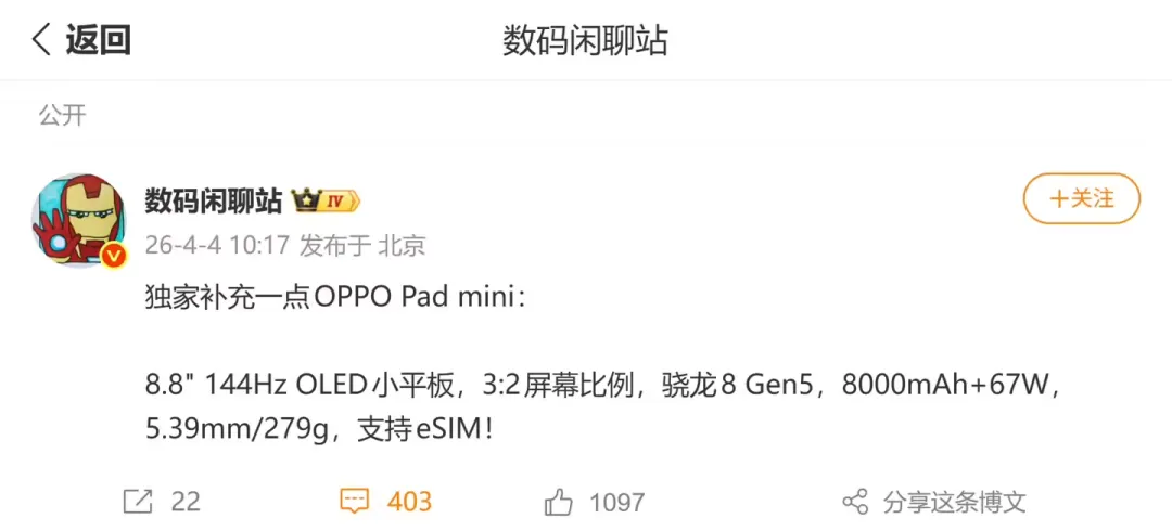 安卓首款骁龙8 Gen5小平板来了,2999元起8.8寸小钢炮?OPPO Pad mini这波参数,279克的骁龙8 Gen5!