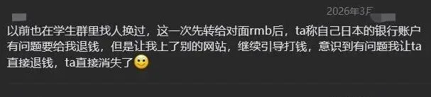 骗子同时联系有 “人民币换日元” 和 “日元换人民币”需求的同学,私下单线沟通不让双方直接联系,还假意安排线下交易。一方同学以为转账给了交易对方,实则钱款全进了骗子口袋,等发现问题时,骗子早已消失,两位同学不仅蒙受损失,还可能产生误会引发纠纷,得不偿失。