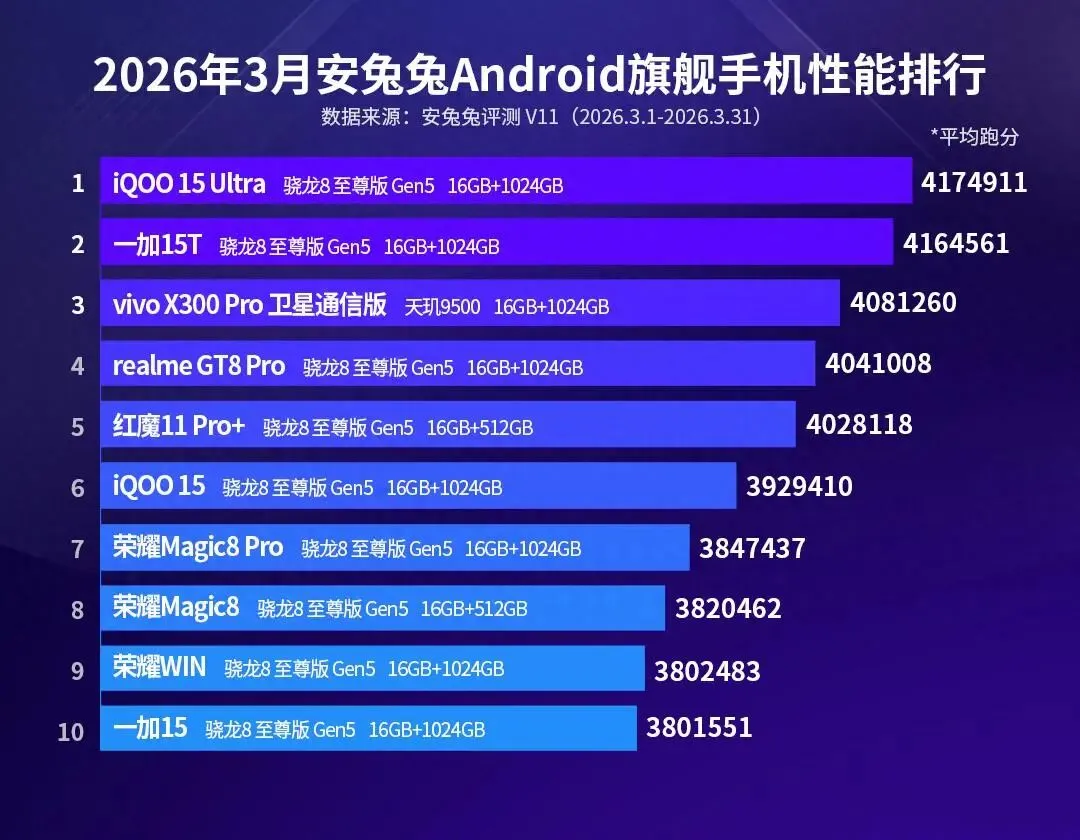排名第一的是iQOO15 Ultra(16GB+1TB),它的平均跑分是417.4万+,该机主打极致的电竞体验,16GB+256GB版到手价5199元。除了提升游戏体验,该机不仅有Monster超核引擎和自研电竞芯片Q3,还有冰穹风冷散热系统和超感游戏肩键,机身内置战鼓MAX双轴震感马达和战鼓大师同轴对称双扬等等。显示方面有2K三星珠峰屏,续航组合是7400mAh+100W+40W双重闪充,后置5000万全焦段三摄组合,各种外围配置应有尽有。在预算允许的情况下,建议16GB+512GB版本起步,到手价为5499元起。