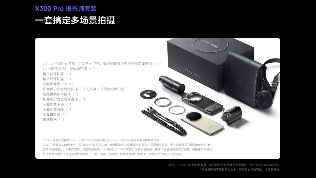 排名第三的是vivo X300 Pro卫星通信版(16GB+1TB),这个版本仅存在于摄影师套装中,某自营平台到手价为7957元,内含手机本体、增距镜、镜头前后保护壳、专业影像保护壳、金属装饰环(2个)、专业摄影手柄、专业影像肩绳和专业摄影包等等。和普通版本相比,卫星通信版的独占优势不仅仅是北斗卫星通信,还有更先进的LPDDR5X Ultra Pro,普通版采用的是LPDDR5X Ultra。如果对拍照有极致的需求,vivo X300s和vivo X300 Ultra已经正式发布,还有全新的增距镜头。