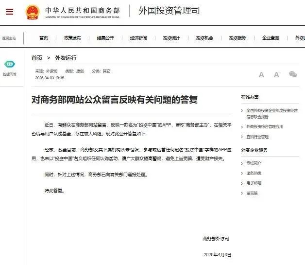 近日,商务部外资司发布公开答复,明确澄清:商务部及其下属机构从未组织、参与或运营任何冠名“投资中国”字样的APP,也未以该名义开展任何认购活动。这一官方辟谣,不仅戳破了一款假冒“商务部主办”、诱导用户认购基金的诈骗APP,更再次为全社会敲响了金融反诈的警钟——在投资理财领域,“官方背书”从来不是轻信的理由,警惕虚假身份、守住财产安全,才是每一位投资者的必修课。近年来,以“国家项目”“官方主办”为噱头的投资骗局屡见不鲜,“投资中国”APP并非个例。这类骗局的核心套路,本质上是利用普通民众对政府部门的信任,通过伪造官方身份、模仿官方界面、编造权威背书,快速瓦解投资者的防范心理。骗子们精准抓住了部分投资者“求稳、求高收益、信官方”的心理,用“商务部主办”的虚假名头包装基金产品,用看似“合规”的平台诱导转账,最终让不少人在“官方背书”的幻觉中落入陷阱,遭受财产损失。更值得警惕的是,这类骗局往往披着“服务国家战略、分享发展红利”的外衣,极具迷惑性,甚至能让有一定投资经验的人放松警惕。此次商务部的及时辟谣,既是对受骗群众的权益保护,也是对诈骗行为的有力震慑。但我们必须清醒地认识到,官方辟谣只是事后止损的手段,真正的安全防线,永远建立在每一位投资者的自我防范之上。从过往案例来看,此类假冒官方的投资骗局,往往有几个共同特征:一是冒用国家部委、权威机构名义,编造“官方认证”“政策扶持”等虚假信息;二是承诺远超市场水平的“保本高收益”,用“稳赚不赔”的诱饵吸引投资者;三是通过非正规渠道传播,多以私发链接、社群推广等方式引流,无法在官方应用商店下载;四是诱导私下转账、充值,拒绝通过持牌金融机构的正规渠道交易。这些特征,正是识别骗局的核心标尺。对于普通投资者而言,守住钱袋子的关键,从来不是依赖“官方背书”,而是建立理性的投资认知和严格的风险意识。首先,要牢记“官方不背书投资产品”的铁律:政府部门的核心职责是监管市场、服务公众,绝不会直接主办、运营投资类APP,更不会为具体基金产品“站台”。任何以“某某部委主办”为噱头的投资项目,本质上都是诈骗。其次,要坚守“正规渠道投资”的底线:所有投资理财行为,必须通过银行、证券公司、基金公司等持牌金融机构的官方渠道开展,切勿点击陌生链接、下载非正规APP,更不要向私人账户转账。最后,要摒弃“一夜暴富”的幻想:高收益必然伴随高风险,不存在“保本高息”的投资产品,凡是承诺“稳赚不赔”“只涨不跌”的项目,100%是骗局。同时,此次事件也提醒相关监管部门,要进一步加大对假冒官方名义诈骗行为的打击力度,畅通举报渠道,及时发布预警信息,从源头压缩诈骗空间;平台方也要强化审核责任,对冒用政府部门名义的推广内容严格筛查,防止诈骗信息扩散;而媒体则要持续做好反诈宣传,提升公众的识别能力,让骗局无处遁形。金融市场的健康发展,离不开每一位参与者的理性与警惕。“投资中国”APP的骗局再次证明,诈骗手段在不断升级,但骗局的核心逻辑从未改变:利用信任、制造幻觉、诱导转账。唯有始终保持清醒,不被“官方名头”迷惑,不被“高收益”诱惑,守住正规渠道、理性投资的底线,才能真正筑牢财产安全的防火墙,让每一份投资都走在阳光下。