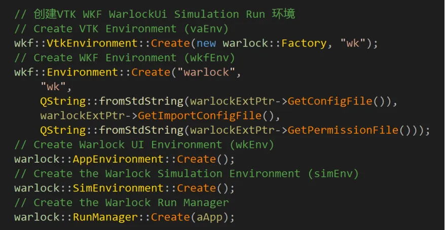 intmain(int argc, char* argv[]){QApplication a(argc, argv);// 初始化 VTK WKF 环境wkf::VtkEnvironment::Create(new wkf::Factory());wkf::Environment::Create("HSimulation", "HSimulation");// Todo,请继续下文return a.exec();}