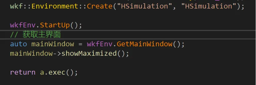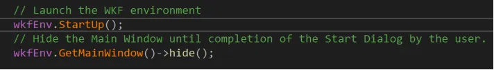 warlock代码的执行逻辑是启动wkf后获取主窗口,再隐藏掉。是为了先显示出场景选择对话框(GetMainWindow->hide()后的代码)。其实这里也可以不隐藏主窗口的。注释掉wkfEnv.GetMainWindow()->hide(); 代码即可,不会有什么影响。因此我们在之前代码中只需添加一个StartUp调用,然后获取到MainWindow,然后show出来即可。如下: