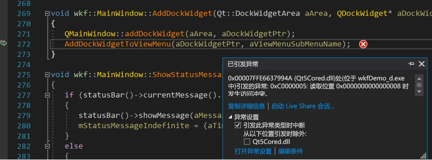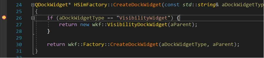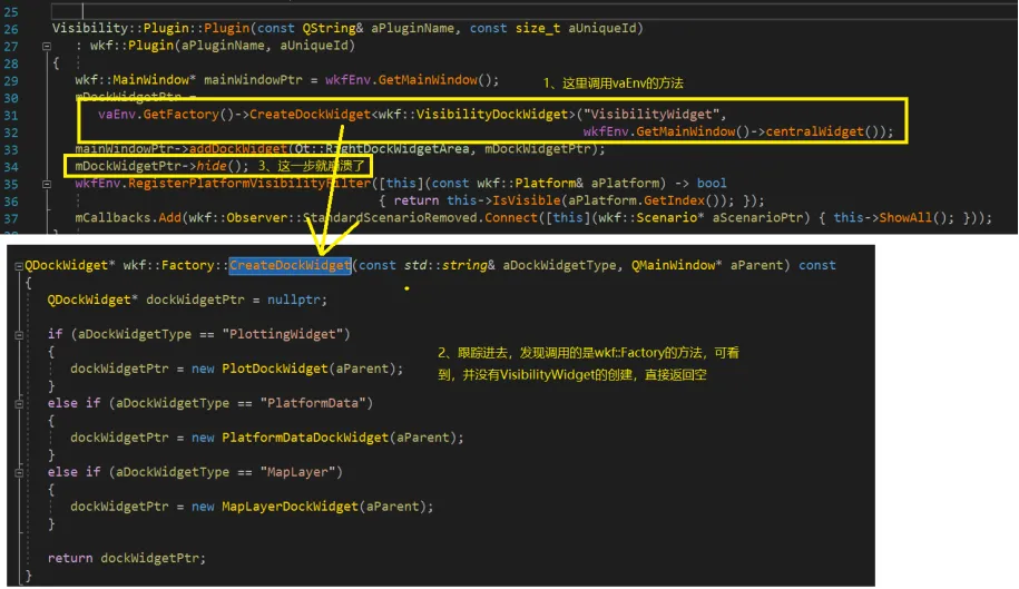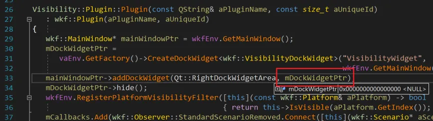 那为什么是空指针呢?上图中通过vaEnv.GetFactory()->CreateDockWidget()方法返回进行赋值,但为空指针,那么问题就出在这个CreateDockWidget方法里面。在这里面打个断点,再次调试发现,这里的参数“VisibilityWidget”,在wkf::Factory的CreateDockWidget里面并没有处理,直接返回了nullptr,所以这里的mDockWidgetPtr才为空,造成崩溃。