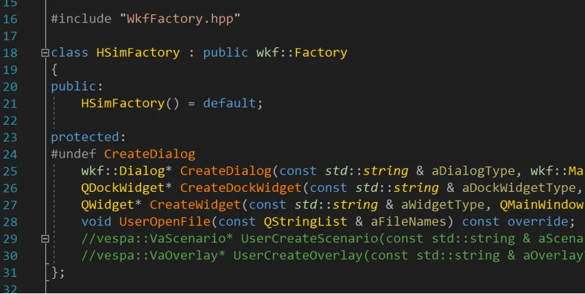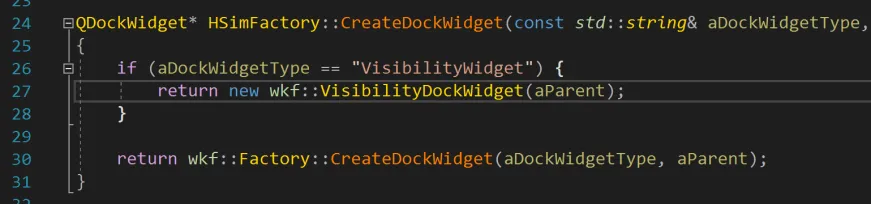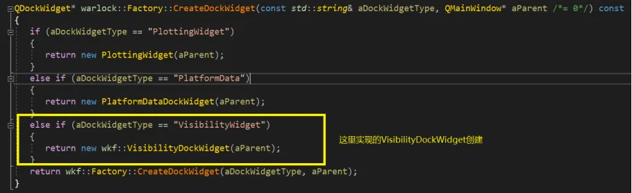 找到了问题,本来想仿照warlock尝试修改源代码wkfFactory.cpp中的这个方法,让它支持VisibilityDockWidget的创建和返回,但发现在wkf工程的实现里面找不到VisibilityDockWidget。查看这个类的实现是放在wkf_common项目里面,而wkf框架工程并没有引用wkf_common也不应该由wkf来依赖wkf_common,这会违背依赖倒置的原则。所以需要采用另外一种办法来解决这个问题。我这里是在自己的界面程序项目中创建继承wkf::Factory的类来支持VisibilityDockWidget的创建和返回(如warlock::Factory的实现那样)。
