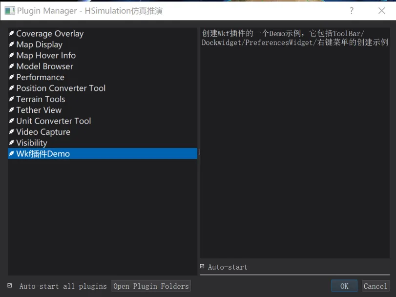 将上面两个文件进行编译,会在wkf_plugin目录下生成一个动态库文件。运行上面创建的界面程序Demo,就可以在opentions/pluginmanager菜单下看到我们创建的插件了。