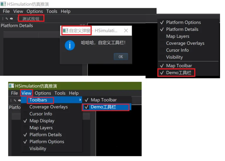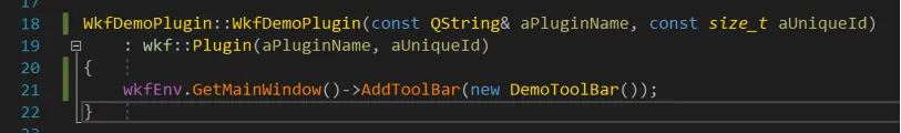 最后在WkfDemoPlugin.cpp中创建DemoToolBar实例,并添加到wkfEnv的MainWindow中。