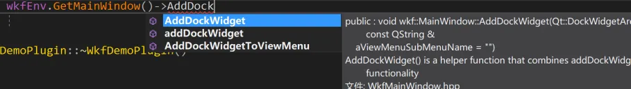 与创建ToolBar界面类似,也是使用Qt向导创建一个界面类DemoDockWidget并继承至QDockWidget。然后在WkfDemoPlugin.cpp中创建DemoDockWidget实例,并添加到wkfEnv的MainWindow中。这里AddDockWidget有三个方法,其中addDockWidget为QMainWindow的自身方法,AFSim建议不使用此方法来添加DockWidget,而是使用其他两个: