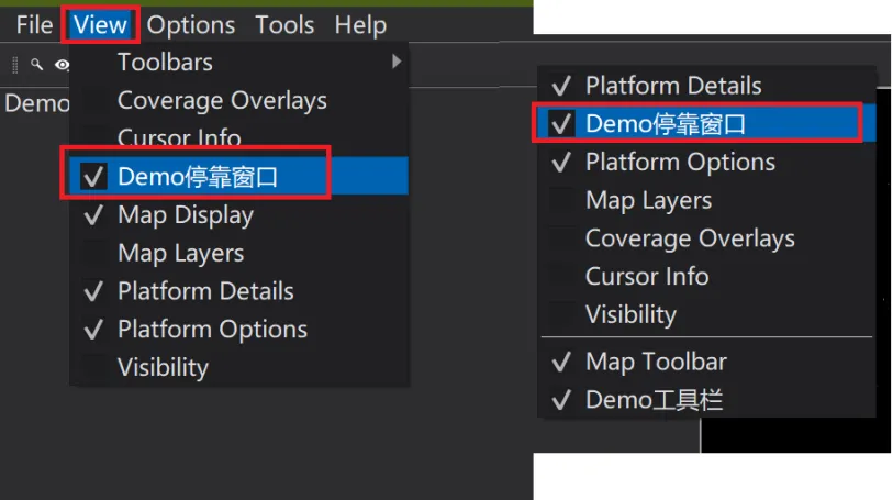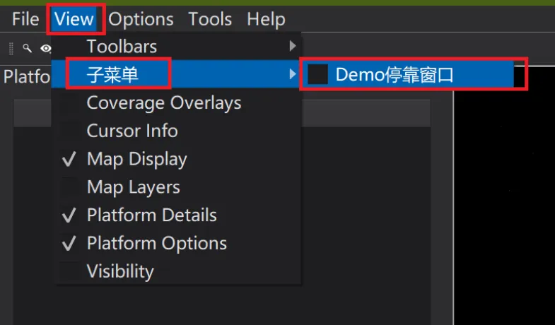 AddDockWidgetToViewenu是将创建的DockWidget添加到View菜单或指定的View的子菜单下,并通过点击菜单弹出窗口。严格来讲不是停靠窗口,而只是将DockWidget以对话框的形式展示了出来,并不能在任何的DockArea中停靠。