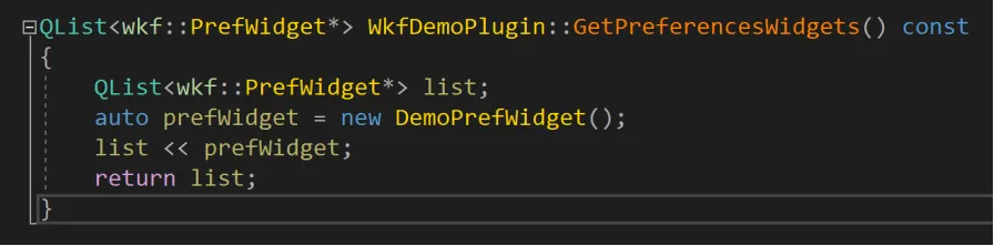 这里只需要在我们创建的插件类中重写wkf::Plugin的GetPreferencesWidgets方法,返回我们的PrefWidget对象即可,AFSim在需要时会自动调用此方法用于构建Preferences界面。