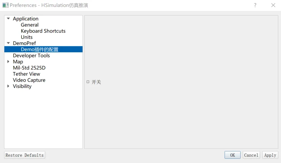 DemoPrefWidget::DemoPrefWidget(QWidget *parent): wkf::PrefWidgetT<DemoPrefObj>(parent), ui(new Ui::DemoPrefWidgetClass()){ui->setupUi(this);// 这个在Preference界面左边树形结构的显示this->setWindowTitle("Demo插件的配置");}// 这个方法是在界面上点击Cancel时触发的,用于将未改变的配置信息更新到界面// 查看PrefDataType的类型可知它就是 DemoPrefDatavoidDemoPrefWidget::ReadPreferenceData(const PrefDataType& aPrefData){ui->checkBox->setChecked(aPrefData.m_isOn);}// 这个方法用于将界面数据更新到配置对象DemoPrefDatavoidDemoPrefWidget::WritePreferenceData(PrefDataType& aPrefData){aPrefData.m_isOn = ui->checkBox->isChecked();}